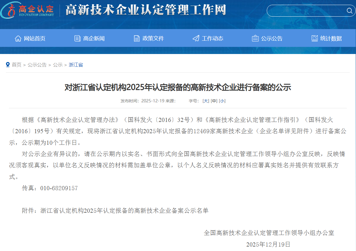 近日,高新技术企业认定管理工作网发布了《浙江省认定机构2025年